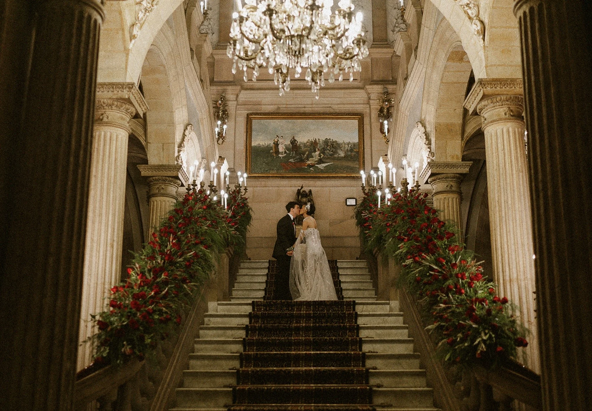Inside, the experience becomes even more editorial. Marble floors reflect natural light filtering through stained glass ceilings, while sweeping staircases—crafted in rich wood and framed by intricate details—create dramatic entrances worthy of a fashion campaign. High ceilings adorned with frescoes and crystal chandeliers elevate every moment, transforming even the simplest gesture into something cinematic.